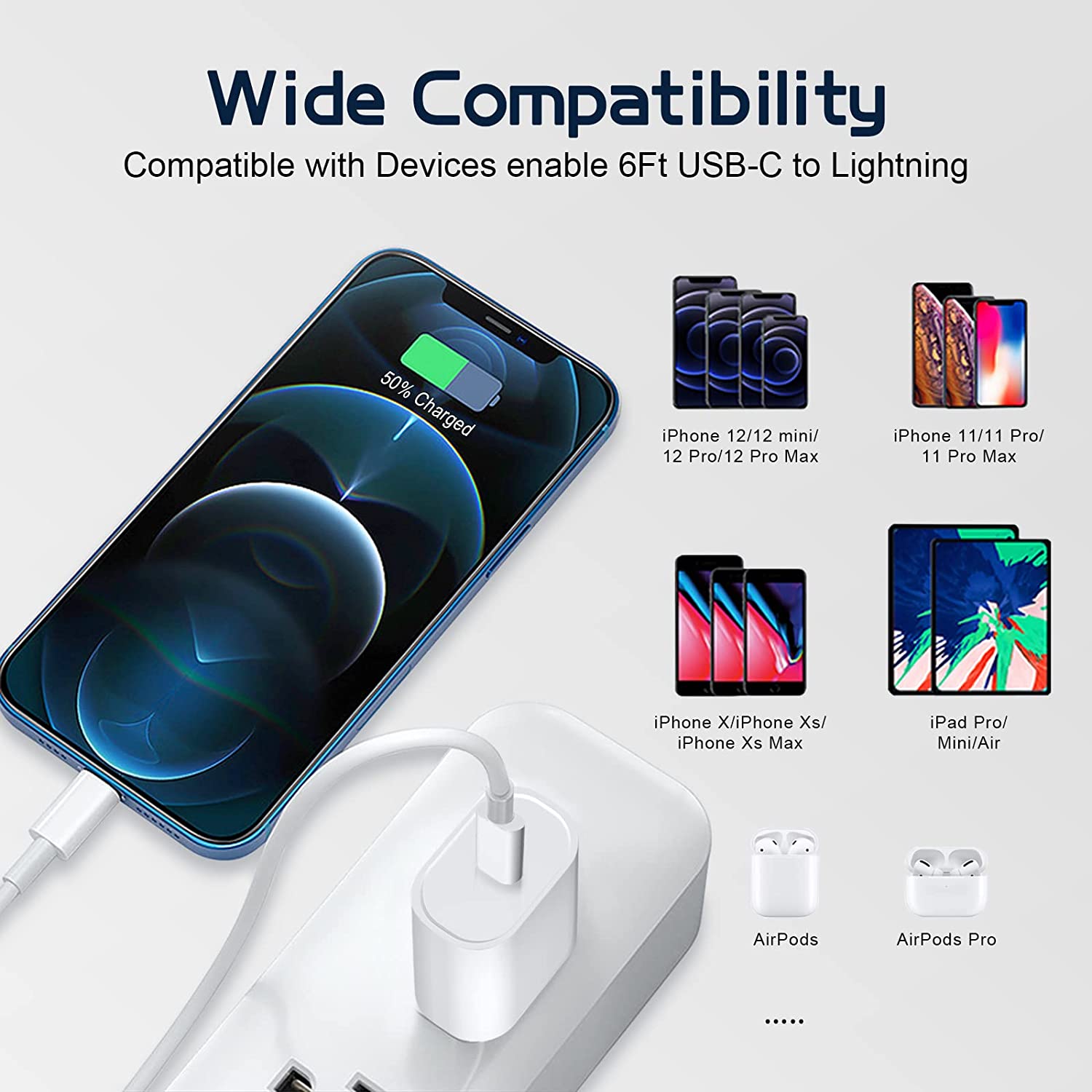 - iPhone 12 13 14 Fast Charging : PD 3.0 20W USB-C charger with 6ft type c to lightning cord, charges iPhone 12 13 14 up to 50% in just 30 minutes, which saves more than 1 hour for you, when compared to the 5W original charger.