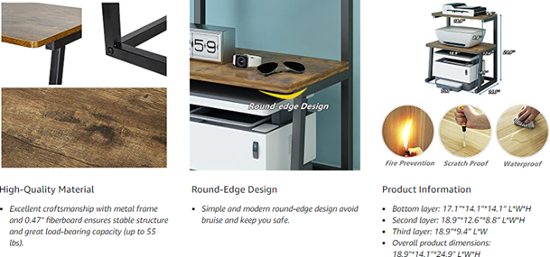 - 【3-TIER DESIGN】Our desktop printer stand comes with a 3-tier design. You can place the printer on the lower layer with more space, and place office supplies on the other two layers. The 3-tier design can save more space and provide a better storage effect.