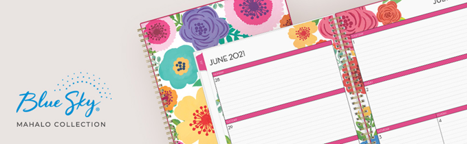 Plan your year in style with the beautiful florals and bold color palette of the 2021-2022 academic year Mahalo collection. This stylish CYO (create your own) cover planner will keep you organized everywhere you go. Add in your favorite photos, sentiments, notes or memories to the clear cover pocket, and keep organized with dated weekly and monthly pages inside for easy scheduling. Fresh page designs add a touch of style and offer plenty of room for all of your important information. Designed with practicality and ease of use in mind, this academic agenda's monthly calendar tabs allow for easy access to each month’s plans while weekly views offer ample writing space for detailing each day. High quality white paper provides clean writing space for jotting down your appointments, to-dos and reminders. Durable coated tabbed dividers are long lasting and make accessing information a breeze. Use this dated academic planner to keep track of your appointments, and to write down notes and ideas in one place. Premium quality covers and twin-wire binding provide reliable durability for daily use. Stay on track throughout the academic year with this 8.5 x 11 planner dated July 2021 - June 2022. Mix and match with other Mahalo Collection planning products from Blue Sky to organize your daily life. Blue Sky creates modern and sophisticated organizational planners and calendars to fit the scheduling needs of busy people - whether it’s for business professionals, college students, teachers, or anyone with appointments to make note of. Keep your life organized with our full line of products including desk pad calendars, wirebound tabbed weekly and monthly planners with contacts and notes pages to accommodate your scheduling needs, and laminated two-sided wall calendars, all in a variety of colors and patterns to suit your lifestyle and personality.