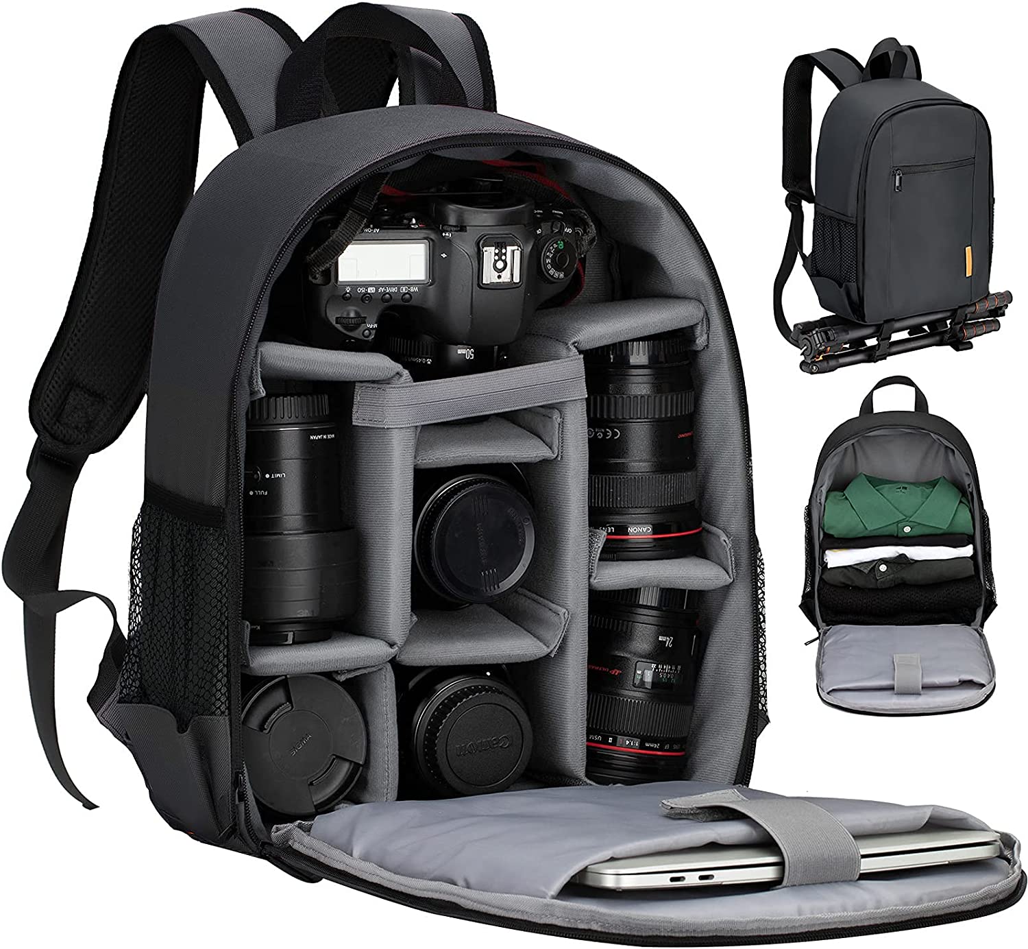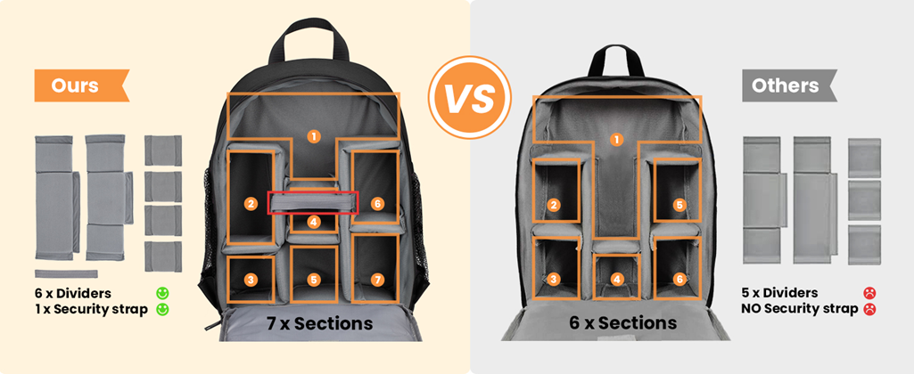 Dedicated camera compartment with removable padded dividers; fits 1 camera 6 lenses at once. Can be used as a daily backpack just take out the dividers to arrange your various daily goods such as clothes, cellphones, books, and so on.