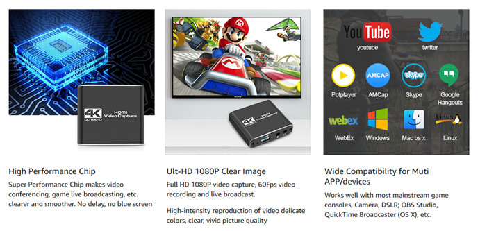 - 【Wide Compatible with Multiple Systems】: 4K PC capture card is suitable for Windows 7/ 8/ 10, Mac OS X 10.9 or above, Linux and many other systems. Compatible with PS4, Nintendo Switch, Camera, Webcame, DSLR, be real-time streaming on Twitch/Youtube/OBS/Potplayer/VLC more easily with your gameplay.