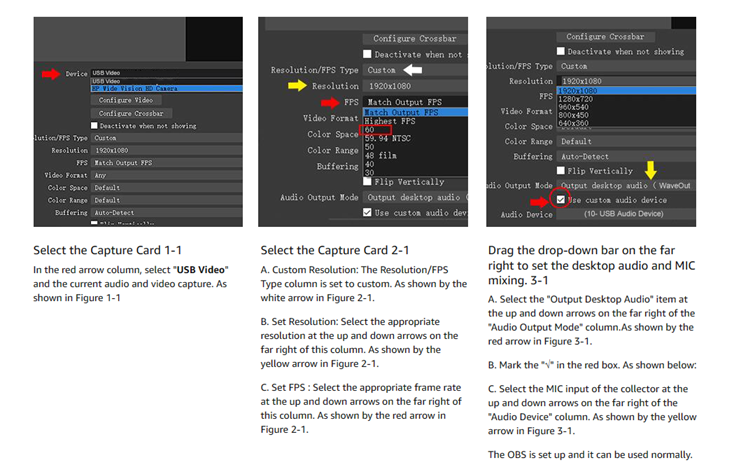 - 【Quality service and Notice】: You will get 1xHDMI capture card, 1xUSB 3.0 cable, and 1xuser manual. Please note that the OBS Studio software needs to be restarted after audio settings are completed, otherwise it will cause no sound output. And you will get actual 1080p records by connecting USB port monitor after insert MIC/Audio Output devices