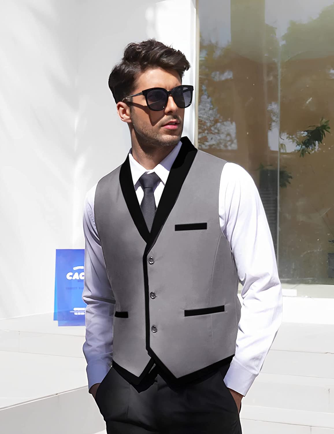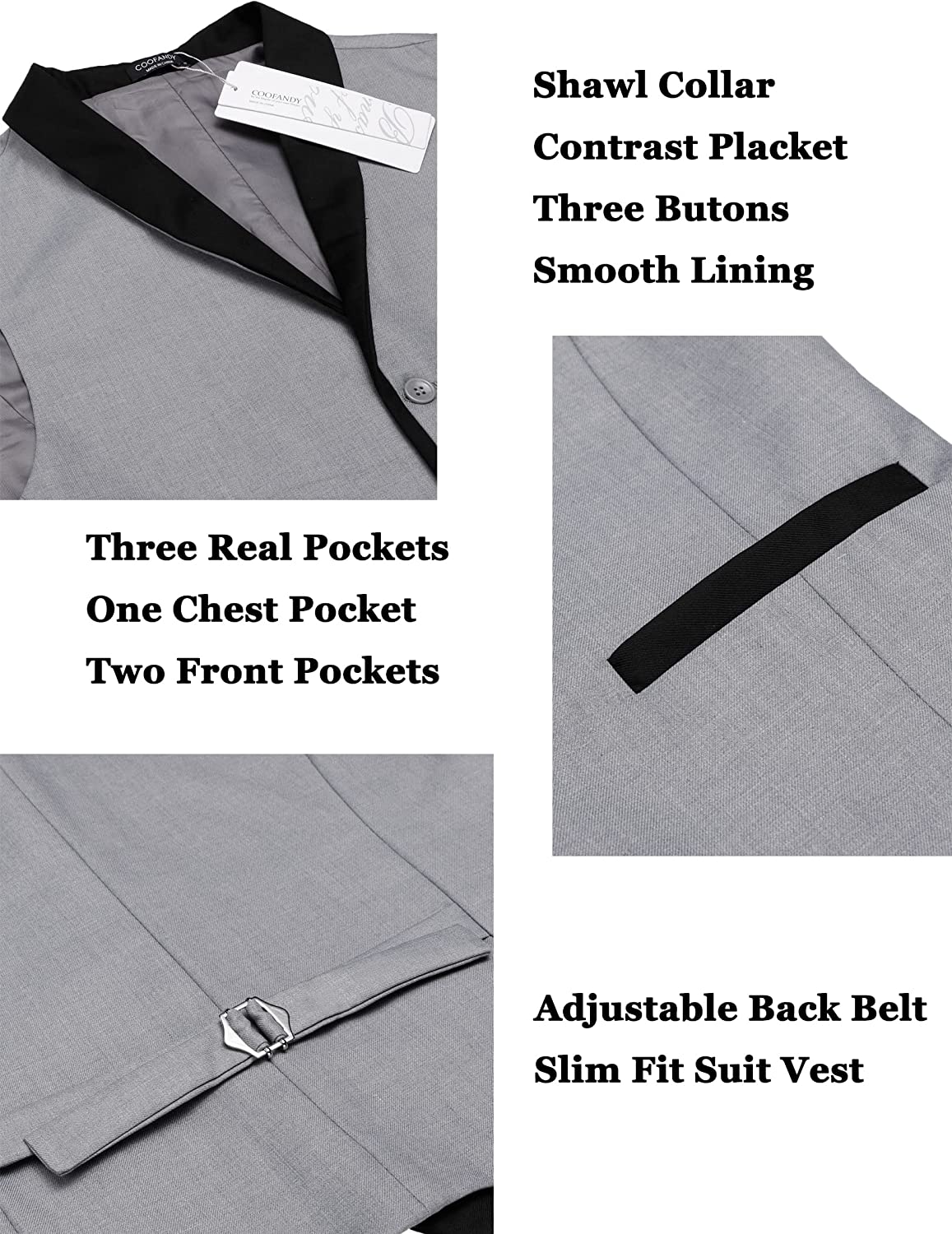 - The Men's suit vest design with shawl collar, Two real side pockets and one real chest pocket;Adjustable back belt,3 Buttons V-neck men's dress vest,New Stylish slim fit style black grey,blue vest for men