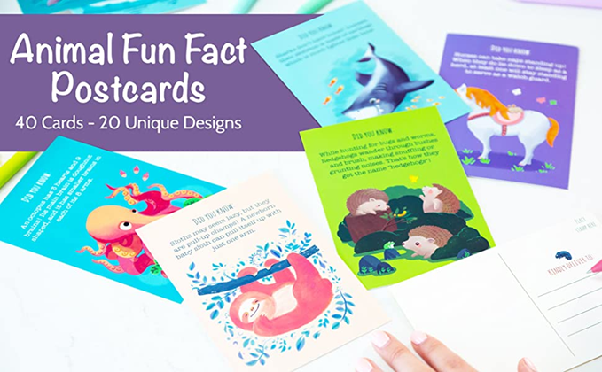 - 40 POSTCARDS, 2 OF EACH DESIGN - Our bulk 40 postcards set features 20 cute animal designs and amazing fun facts. It will be hard to decide which postcard to send out, because you’ll want to share them all!