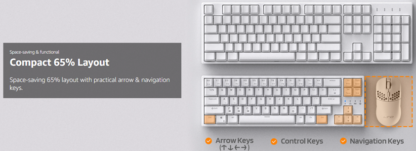 • Compact but Practical 65% Layout - Ultra-compact design with 68 keys portable layout. Geared with the practical arrow, navigation, and control keys, it well balanced the characteristic of functional and space-saving.