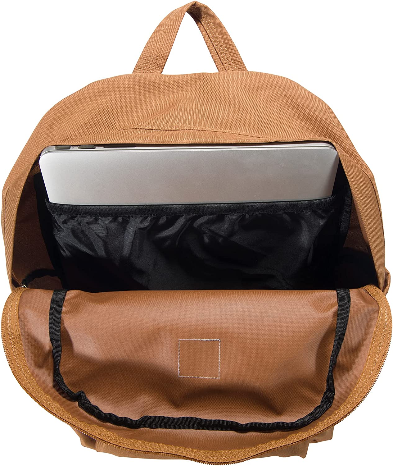 Imported No lining lining Zipper closure Carhartt Essential 21L Laptop Backpack. Big enough to carry your day’s essentials, strong enough to take on anything 600-denier polyester with Rain Defender durable water repellent Pack features large main compartment with dedicated 15-inch laptop sleeve. One exterior side pocket Front zippered organization compartment and comfort shoulder straps Backpack Dimensions: 12” X 17.5” X 8.75” Volume: 21L
