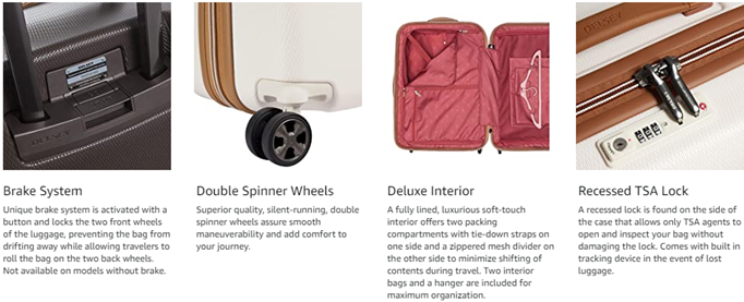 • Four spinner wheels assuring a stable base with multi-directional rolling with zero weight on your hand for easy travel; 20% lighter than Chatelet with Brake