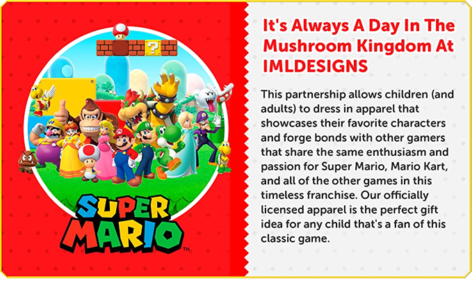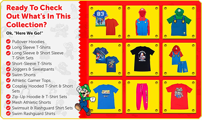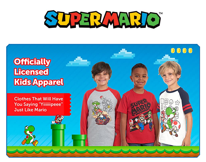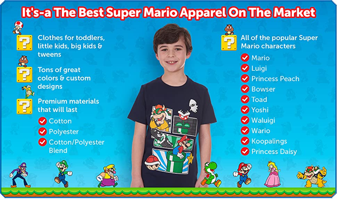 SUPER MARIO BROS SHIRTS FOR KIDS: These 100% cotton shirts are perfect for any little boy who loves playing Nintendo games! The shirts come in multiple colors and designs, including cool prints featuring everyone's favorite character Mario.