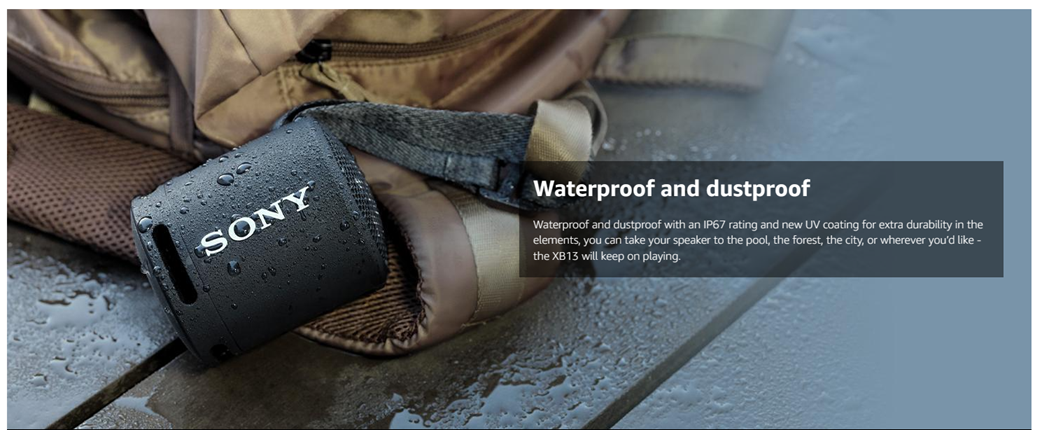 Enjoy big sound with the super-compact SRS-XB13 wireless speaker, featuring EXTRA BASS™, an updated IP67 waterproof and dustproof design1,2, and up to 16 hours of battery life.3 Small enough to fit in a bag or cupholder, the XB13 also features a multiway strap to take it with you everywhere you go.