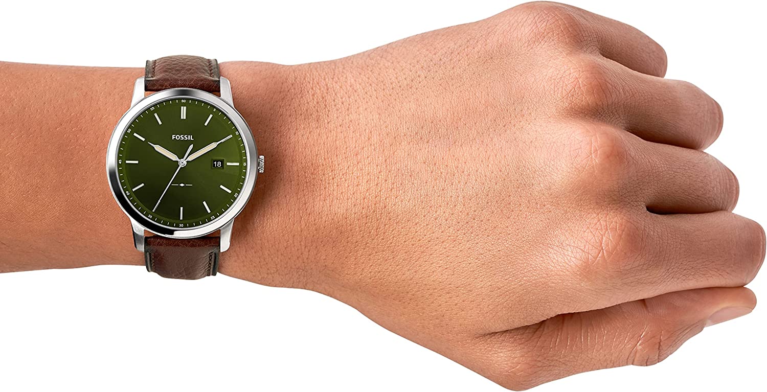 • Stainless steel case made with at least 50% recycled stainless steel and green sunray dial; brown eco leather band with adjustable buckle closure; our eco leather uses a resource-efficient tanning process; interchangeable with all 22mm Fossil watch straps