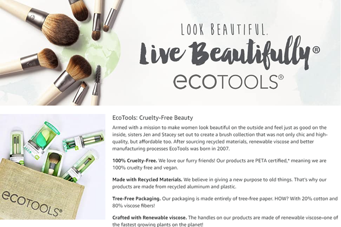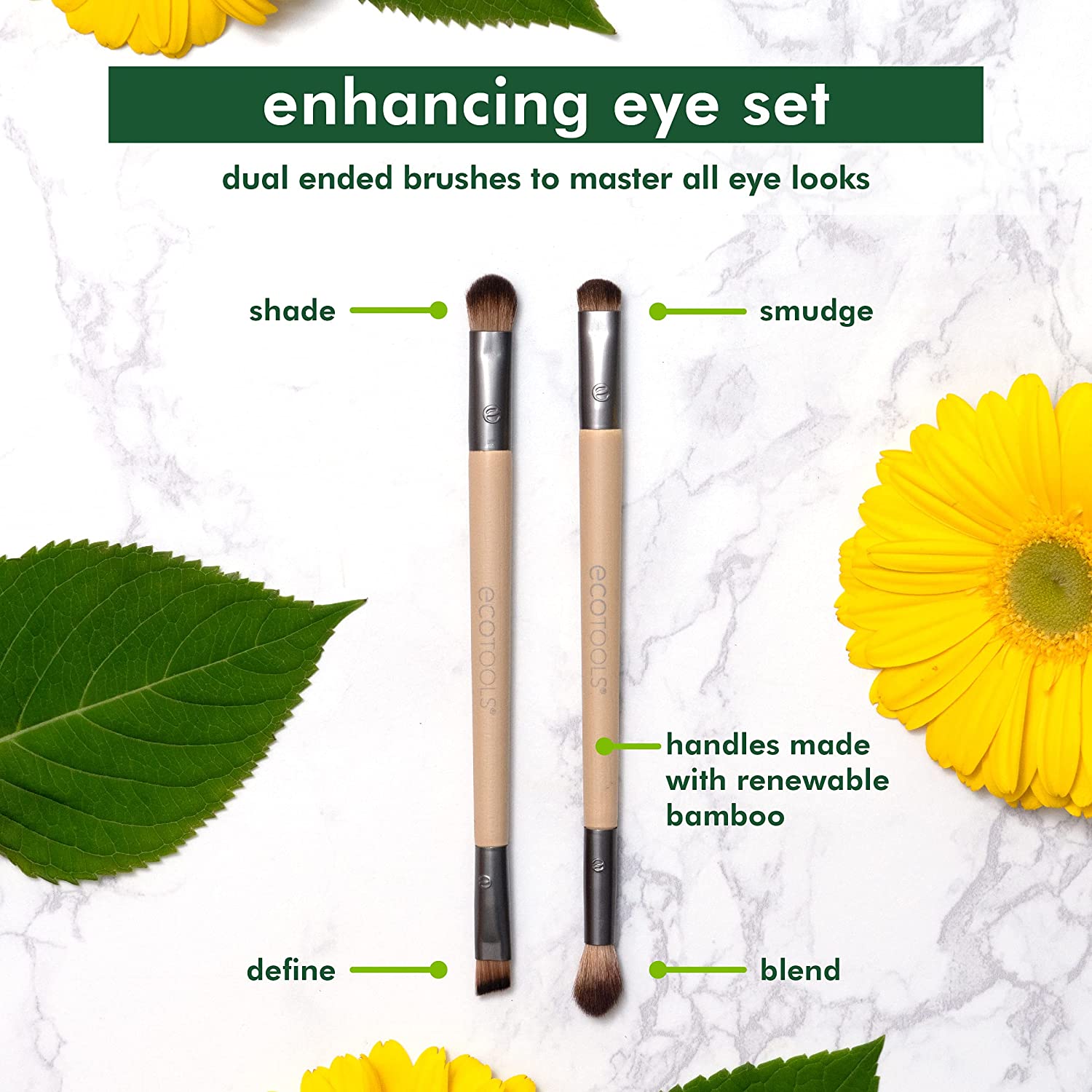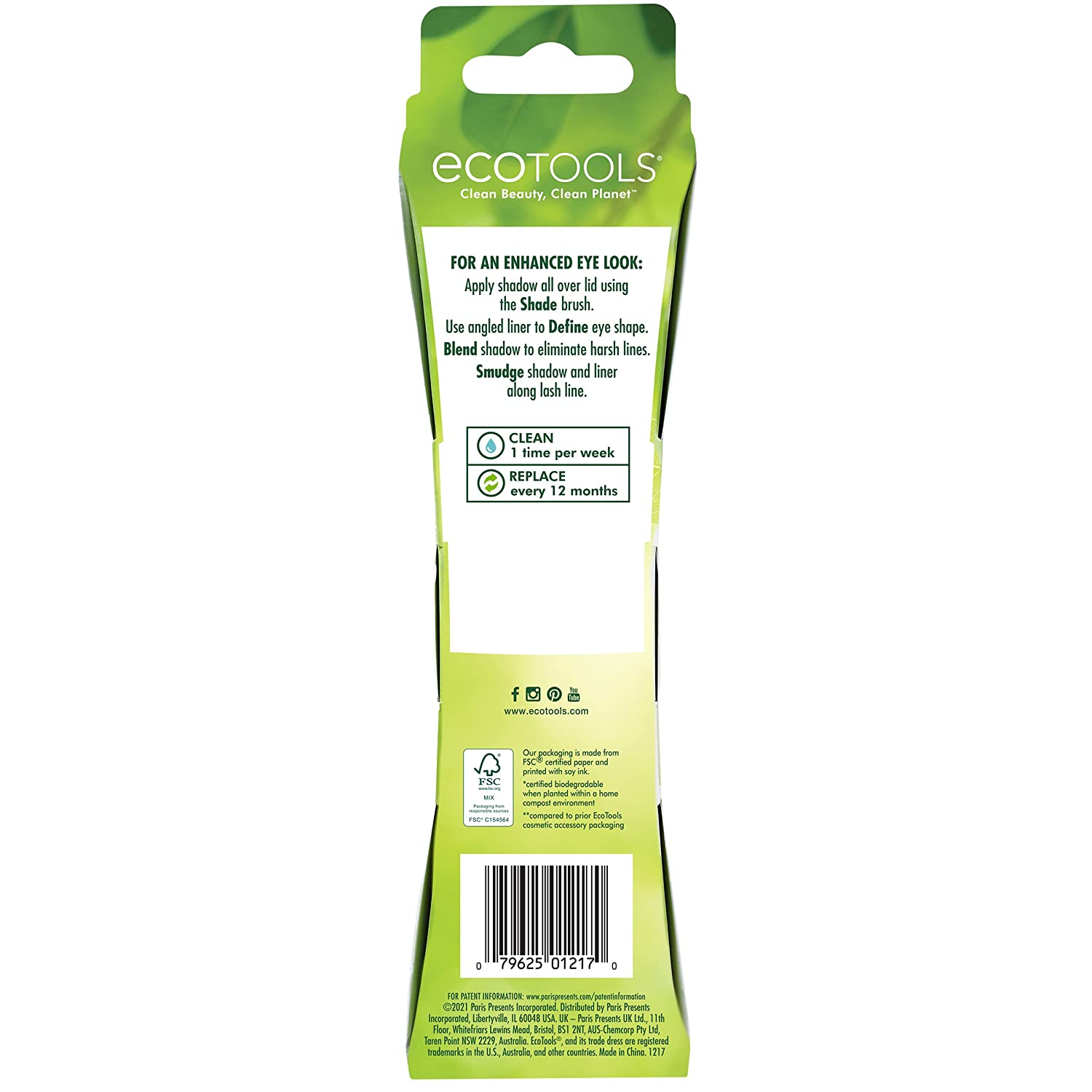 Four makeup brushes condensed into two, freeing up space in your makeup bag and making transformations from day to night a breeze. Each end of the makeup brushes has a description on how to use it. Shade & Define Brush: Apply shadow all over the lid with the shading brush then flip it over and use the defining brush to add contour to the eyes. Blend & Smudge Brush: Blend eyeshadow to eliminate harsh lines with the blending brush, and use the smudge brush to create soft definition along the lash line. Synthetic bristles are cruelty free. Experience the incredibly soft touch of cruelty-free bristles EcoTools beauty solutions promote Living Beautifully! We are inspired by beauty inside and out, and in the world around us. While we always want to look our best, we feel even better when we can make earth-conscious choices. EcoTools remains a favorite of celebrities, beauty editors and women around the world. Best known for our incredibly soft cosmetic brushes and handles, we take pride in offering a collection of cosmetic makeup brushes, hairbrushes, lashes and bath products that feature innovative, materials. Our includes natural materials, reusable pouches, post-consumer recycled paper and plastic, and recyclable packaging. The eco pouch is phthalate-free and PVC-free. Cleaning your Makeup Brushes Unclean makeup brushes transfer old makeup, germs, and bacteria to your skin each time you use them. Ideally, you should wash them once a week, and here’s the best way how: Run the bristles of makeup brush under warm running water. Careful not to get the ferrules and handles wet. Apply a drop of gentle shampoo or clarifying cleanser to bristles and work into a light lather. Rinse bristles thoroughly under warm, running water. Continue rinsing until water runs clear. Use a cloth to absorb excess water and reshape the bristles Lay your makeup brushes flat or “handles up” to air dry.