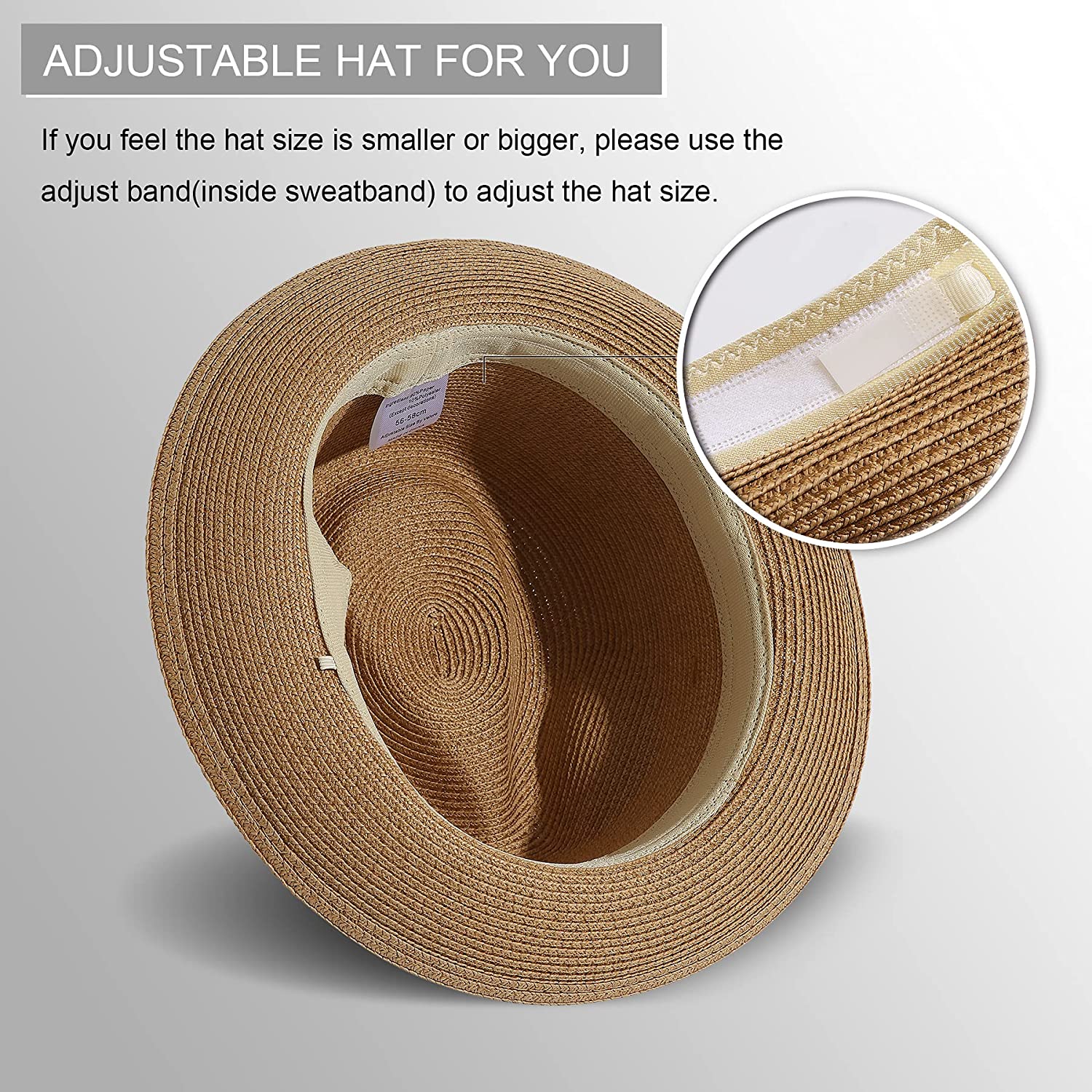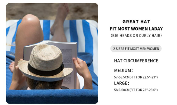 Available in two sizes, our Straw Fedora Hat is designed to fit most head sizes. The Medium Size 57-58.5cm (Fit for 22.5"-23") and Large Size 58.5-60cm (Fit for 23"-23.6") provide a perfect fit for both men and women.