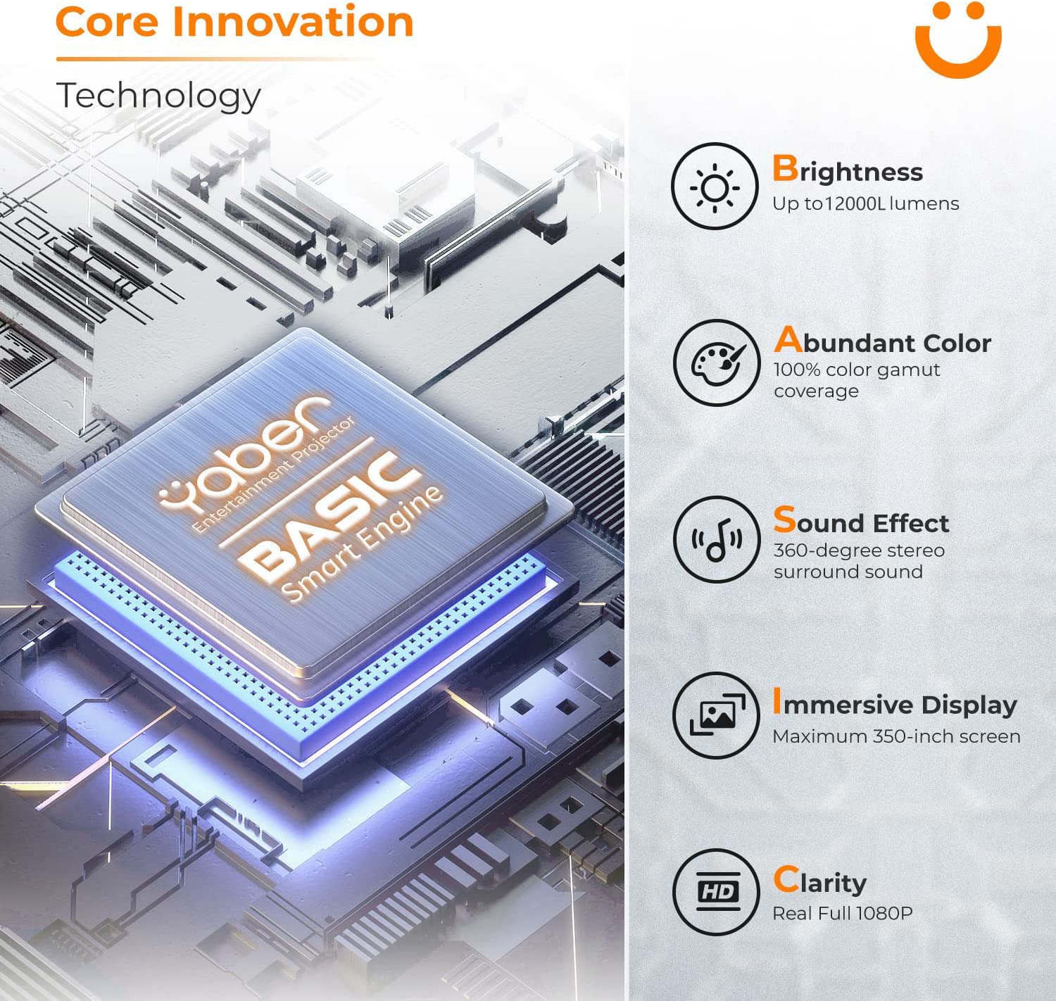 BASIC Smart Engine is a creative projection technology developed by Yaber, through which the best audio-visual experience can be obtained in five aspects——Brightness, Abundant Color, Sound effect, Immersive Display, Clarity.