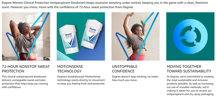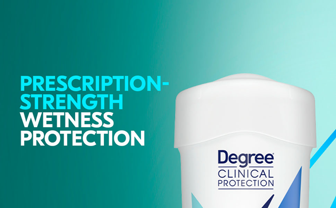 Degree Clinical Protection Shower Clean Antiperspirant Deodorant delivers prescription-strength wetness protection, so you can face the day with confidence. This antiperspirant for women features 72-hour sweat and odor protection and the bright floral scent of rose and jasmine, blended with delicate fruit for an invigorating, clean feeling. Only Degree has MotionSense technology that moves in sync with your body. This clinical strength antiperspirant deodorant releases a burst of subtle fragrance every time you move, for nonstop protection. Degree Clinical Protection Shower Clean Antiperspirant Deodorant keeps you feeling fresher, drier, and more confident. This powerful antiperspirant deodorant responds when you need it most so that you don't have to worry about slowing down. Simply swipe and start moving. This antiperspirant deodorant for women with a tantalizing scent gives you the confidence to keep moving all day long. Degree Clinical Protection Shower Clean Antiperspirant Deodorant keeps you feeling cool, fresh and protected from sweat and odor. Degree gives you the confidence to keep moving, however you move. At Degree, we want to inspire the confidence in everyone to move more and go further. We’re here to support your journey through an antiperspirant that moves with you and helps you go beyond your limits. As well as increasing our use of reusable materials, we’re making it easier for you to recycle our antiperspirant and dry spray packaging. Degree. It won’t let you down.