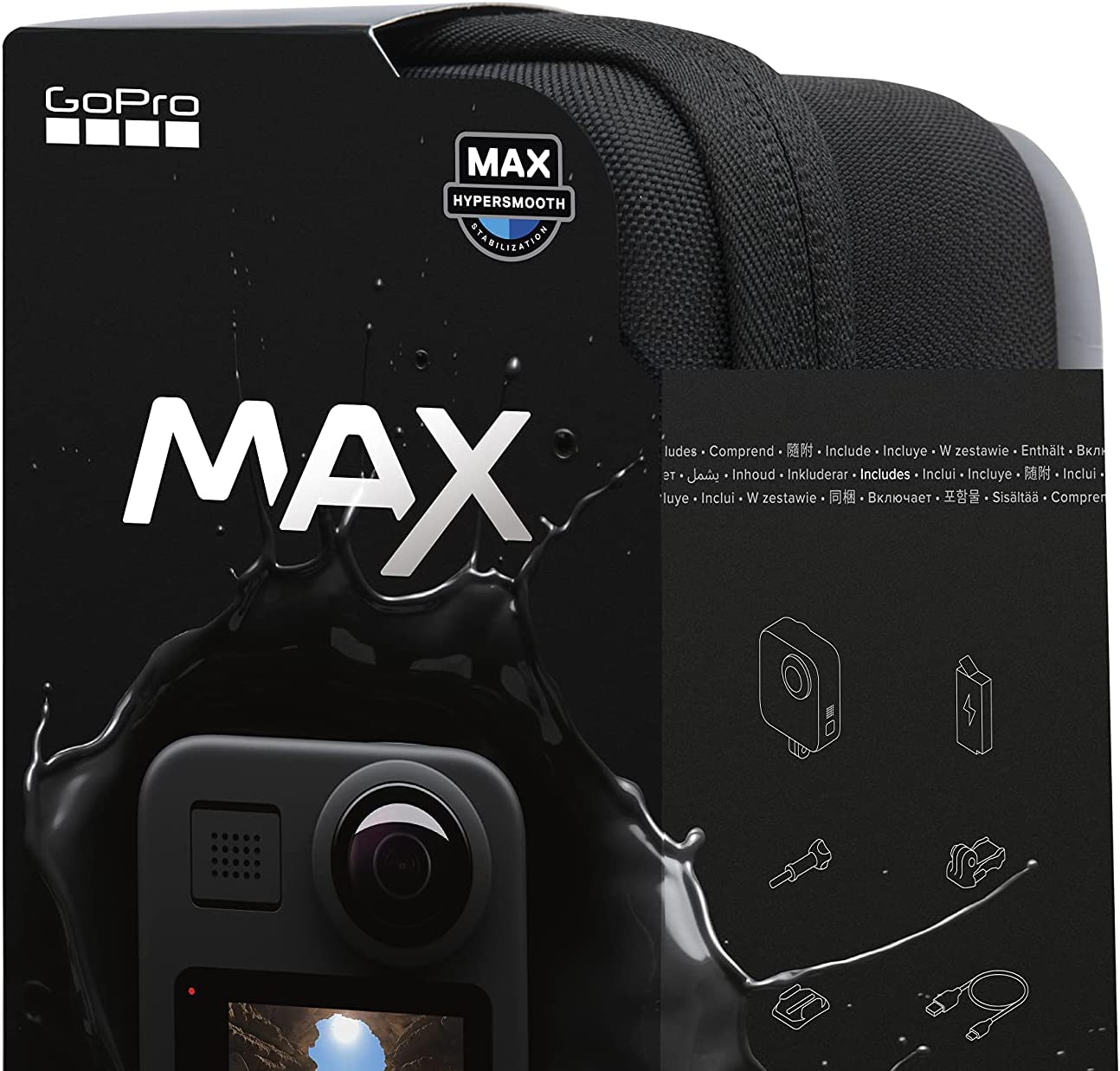 Includes: GoPro MAX Camera, Rechargeable Battery, Curved Adhesive Mount, 2 Protective Lenses, 2 Lens Caps, Microfiber Bag, Mounting Buckle plus Thumb Screw, USB-C Cable, Carrying Case