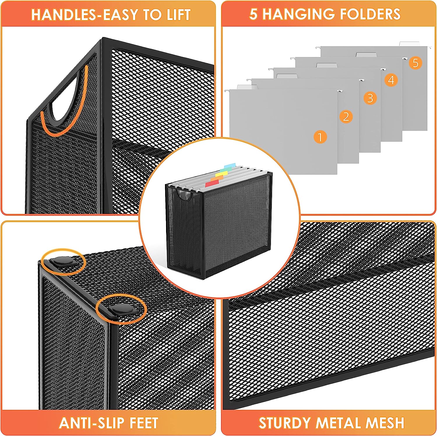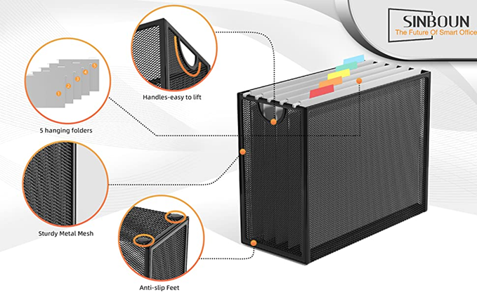 • Includes 5 letter size hanging folders (9.25”W x 12.75”L)with rods and tabs. It will be a perfect accessory for your home, office, school and workspace