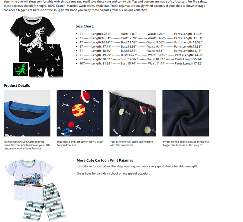 The boys pajamas suited to 2-10 years old boys. If your boys is stronger or taller than average, recommend one or two bigger size because of the snug fit,good air permeability and soft hand feeling.