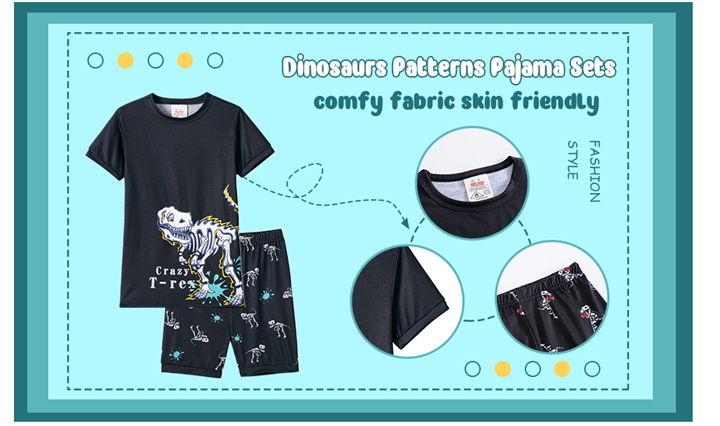 Cute Cartoon Patterns Design: Cute cartoon printed pajamas set specially designed for your boys, the top has a dinosaur print on it, fashionable and stylish, kids favorite. It's the very popular and catch-eye design with every child.