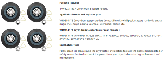 • Package Include:4 ×W10314173 Dryer Drum Support Rollers. In general, the dryer drum support rollers wear at the same speed. When the dryer makes a lot of noise, there are marks on the clothes or dryer doesn’t work, replace the drum support rollers is a more effective solution.
