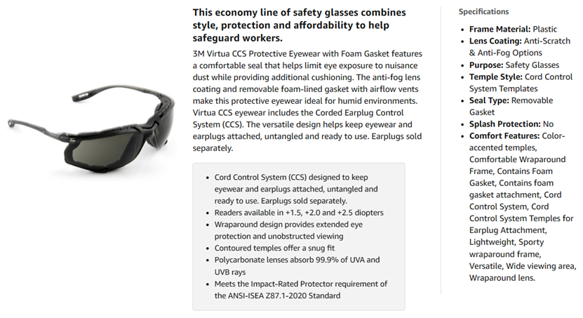 3M Virtua CCS Protective Eyewear with foam gasket features a comfortable seal that helps limit eye exposure to nuisance dust while providing additional cushioning. The anti-fog lens coating and removable foam-lined gasket with airflow vents make this protective eyewear ideal for humid environments. The versatile Corded Ear Plug Control System (CCS) design helps keep safety glasses and ear plugs attached (sold separately), untangled and ready to use, so your team has the convenient, comfortable protection it needs to focus on the jobs at hand. Anti-Fog polycarbonate lens absorb 99.9% UV. Meets the requirements of CSA Z94.3 and is impact rated to ANSI Z87.1 2015. Disclaimer: 3M industrial and occupational products are intended, labeled, and packaged for sale to trained industrial and occupational customers for workplace use. Unless specifically stated otherwise on the applicable product packaging or literature, these products are not intended, labeled, or packaged for sale to or use by consumers (e.g., for home, personal, primary or secondary school, recreational/sporting, or other uses not described in the applicable product packaging or literature), and must be selected and used in compliance with applicable health and safety regulations and standards (e.g., U.S. OSHA, ANSI), as well as all product literature, user instructions, warnings, and limitations. Misuse of 3M industrial and occupational products may result in injury, sickness, or death. For help with product selection and use, consult your on-site safety professional, industrial hygienist, or other subject matter expert.