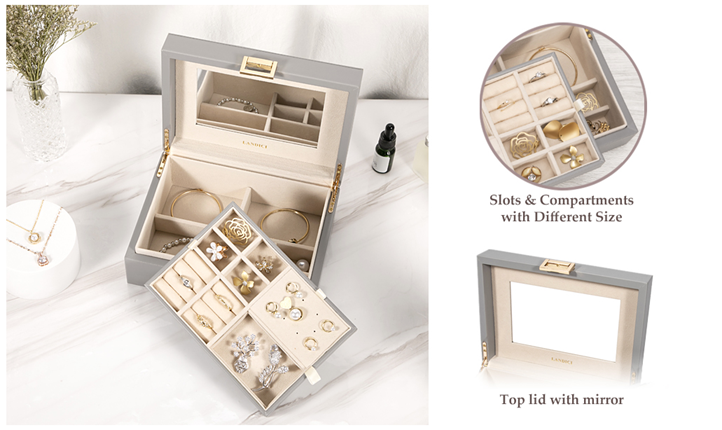- Compact and Functional - The jewelry box is two tier you can place larger pieces at the bottom and small pieces at the top.You are able to consolidate all your pieces into one nice box if you own a ton of jewelry.It compliments any color scheme.It also comes with a key so it can keep your jewelry safe.
