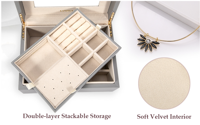 - Modern Spacious & Minimalistic Design - The first level can be used separately.It has 4 Compartments including 1 dedicated ear stud plate(Special double-sided 11 ear studs or earring holes design,you can freely rotate 180° to use),connect with 1 square section(optionally storage bracelets,bangle or lipstick),1 ring area(put 6 pair of rings),1 removable cross divider for storing types of jewel.
