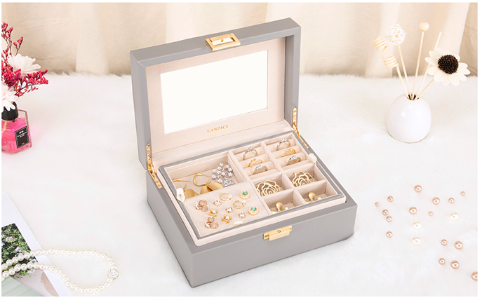 It's so lovely and holds and organizes so much jewelry,but doesn’t take up a lot of space,Good space saver! The exterior is sleek faux leather and the locking latch is easy to use. Top lid with mirror,as makeup mirror,is very pretty on your vanity.Also you will be pleasantly surprised at how adjustable(the slots&compartments with different size) it is and thought what a nice gift it would be for someone.