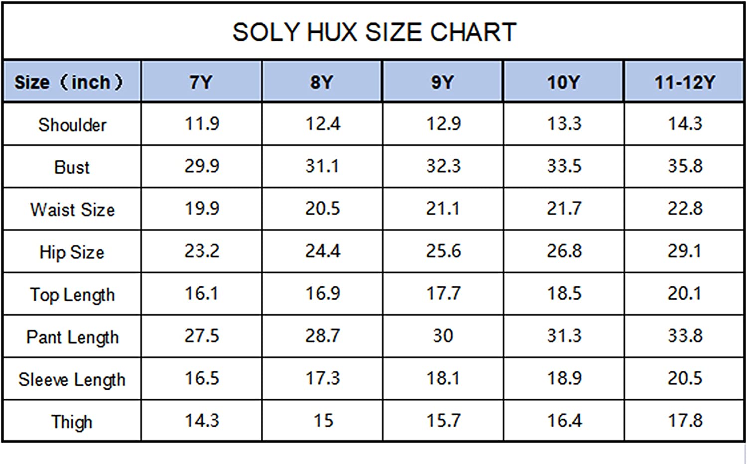 Size Chart:7Y: Shoulder: 11.9", Bust: 29.9", Waist Size: 19.9", Hip Size: 23.2", Top Length: 16.1", Pant Length: 27.5", Sleeve Length: 16.5", Thigh: 14.3", / 8Y: Shoulder: 12.4", Bust: 31.1", Waist Size: 20.5", Hip Size: 24.4", Top Length: 16.9", Pant Length: 28.7", Sleeve Length: 17.3", Thigh: 15", / 9Y: Shoulder: 12.9", Bust: 32.3", Waist Size: 21.1", Hip Size: 25.6", Top Length: 17.7", Pant Length: 30", Sleeve Length: 18.1", Thigh: 15.7", / 10Y: Shoulder: 13.3", Bust: 33.5", Waist Size: 21.7", Hip Size: 26.8", Top Length: 18.5", Pant Length: 31.3", Sleeve Length: 18.9", Thigh: 16.4", / 11-12Y: Shoulder: 14.3", Bust: 35.8", Waist Size: 22.8", Hip Size: 29.1", Top Length: 20.1", Pant Length: 33.8", Sleeve Length: 20.5", Thigh: 17.8"