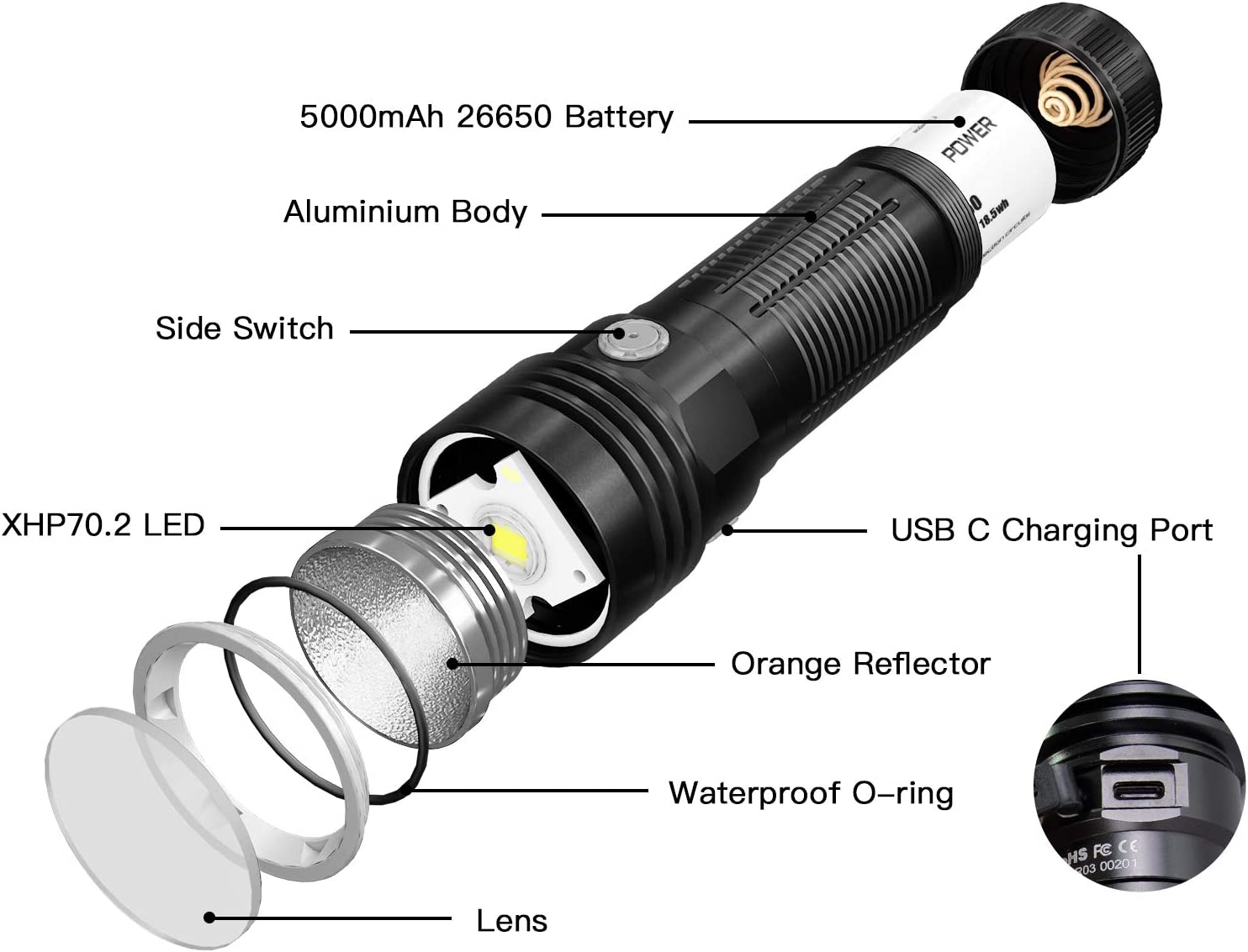 Rechargeable functionMax 2A USB-C charging. During charging, the indicator is RED. After being fully charged, the indicator will be BLUE.When indicator flashes purple, it means abnormal charging. Only firefly, low and medium modes are available while charging.
