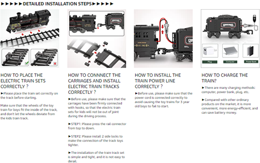 - ?【PERFECT CHRISTMAS TOYS GIFTS FOR KIDS】:This kids train set is a meaningful gift for every child. Model train toys for boys not only allow your kids to play happily, but also allow them to get a close look at the development of industry and technology.During the holiday season, you can also place the Christmas train under the Christmas tree to add a festive atmosphere.These are perfect birthday/Christmas toy gifts for 3 4 5 6 7 8 9 10+ year old boys/girls.