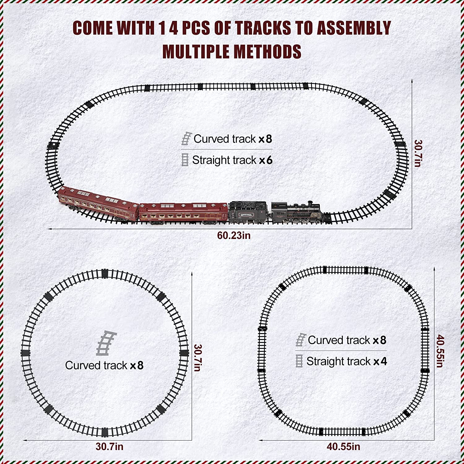 - ?【UPGRADED USB RECHARGEABLE ALLOY TRAIN TOY】:This train set comes with a full alloy steam train ,1 coal carriage and 2 passenger carriages with lights, 8pcs curved tracks and 6pcs straight tracks. Different from other train sets on the market,our train toys have a 1000mAh/3.7V rechargeable lithium battery and a USB charging cable as well as realistic lighting carriages.When fully charged, your child can enjoy hours of enjoyable travel.Tips:The train track size : 5 cm/1.96 in.