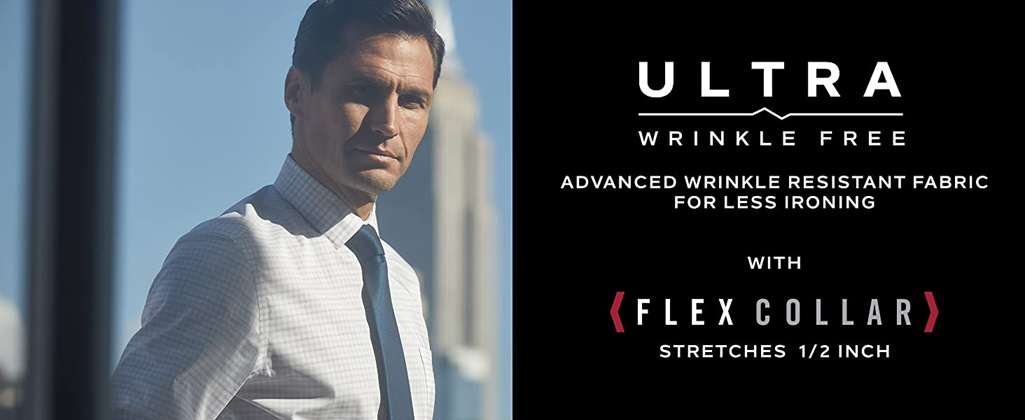 - Ultra Wrinkle Free: Advanced wrinkle-resistant fabric for less ironing and even easier care at home. Flex Collar: Stretches up to half an inch for expandable comfort. Stretch: Fabric stretches and moves with you for extra comfort.