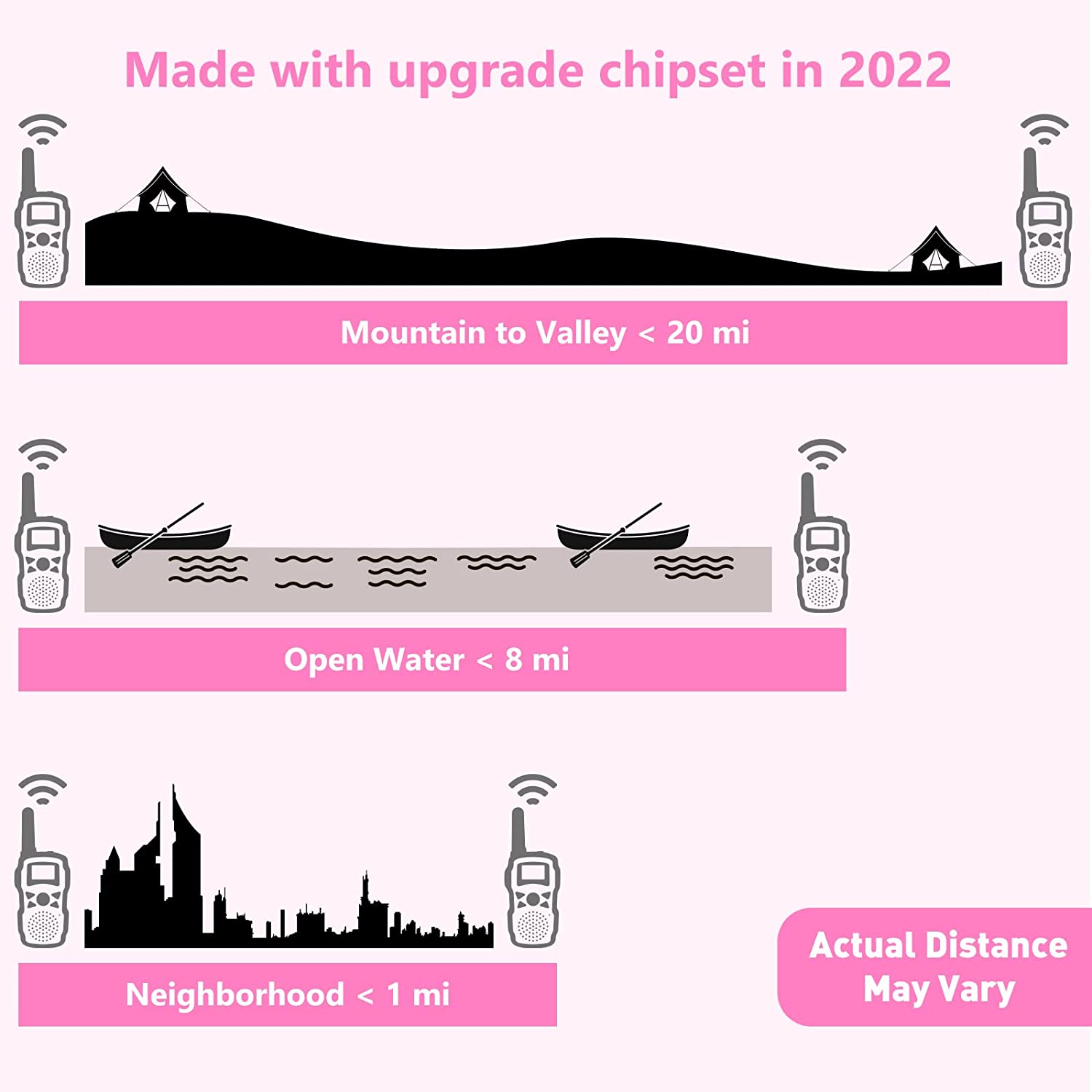 ?【Long Range Radio Walkie Talkies】:The upgraded chipset greatly improved reception sensitivity and enhanced signal stability. Up to 1 mile in neighborhood, up to 20 miles in Mountain to Valley. You and your kids can enjoy a clear and fluent communication around the house and garden. The range in real conditions can be reduced from the maximum range