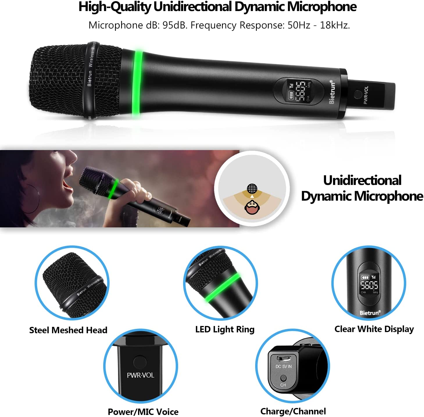 Bietrun Rechargeable Wireless Microphone for Singing, Karaoke,Dual Metal Cordless Handheld Dynamic Wireless Mics with 32FT Bluetooth, UHF 240FT Range for 1/4'',1/8''Output,PA System,Dj,Mixer,Church