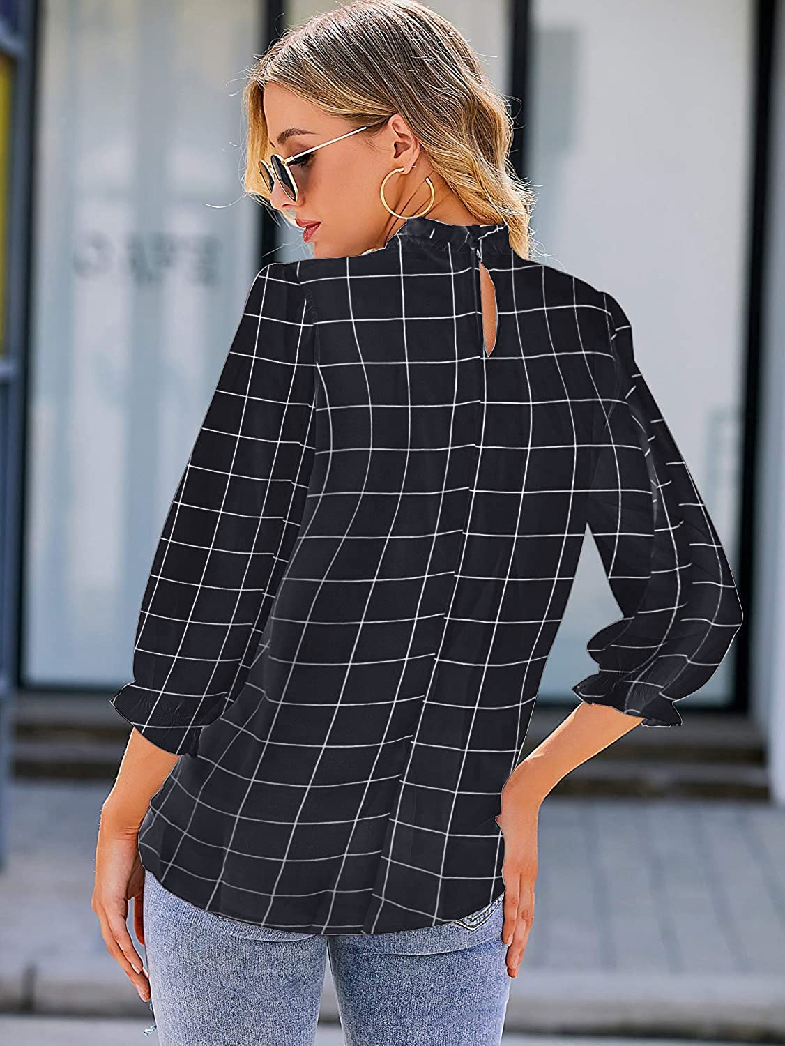 [Feature]: Elegant blouse for women feature with fashion leopard print, 3/4 sleeve with ruffle hem, ruffle neck, keyhole back, frill mock neck shirt