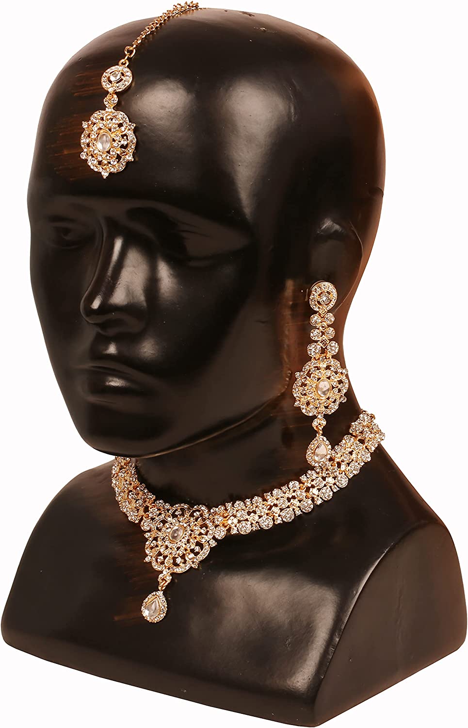 • NEW! Touchstone Indian Bollywood Contemporary Fabulous Style Definition Rhinestone Designer Jewelry Wedding Necklace Set In Gold Tone For Women. EXTRA LONG EARRINGS: Length 3.50 Inches. SPECIFICATIONS: Necklace Length 14 Inches. Extendable/Adjustable With Extra Links/Chain Up To 9.2 Inches. Earring Weight (Single) 15 Gms. Earring Length 3.5 Inches. Earring Width 1.1 Inch. Mang Tika Length 6.4 This is in a special dark gold plating to recreate the look of antique jewelry.