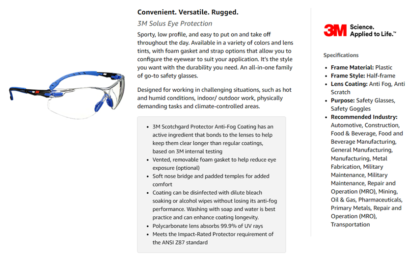 3M Solus 1000 series protective eyewear features Scotchgard Anti-Fog lens coating which helps workers see clearly, longer – providing longer lasting fog resistance than traditional anti-fog coatings. When microscopic water droplets land on lenses without any type of coating, they bead up and form condensation and fog, obscuring your vision. Scotchgard Anti-fog Coating produces a reduced-contact angle, flattening the water beads into a thin, transparent film of water that allows light to pass through. The coating retains its effectiveness for at least 25 washings with water, allowing workers to wear their eyewear longer. The coating can be disinfected with diluted bleach soaking or alcohol wipes without losing its anti-fog performance. Washing with soap and water is considered a best practice and can enhance coating durability. These safety glasses have a low profile and are available in bold, modern colors for a personalized style. Based on 3M internal testing per EN168 test method when compared with traditional anti-fog coatings. Meets the High Impact Requirements of CSA Z94.3-2007 and the High Impact Requirements of ANSI Z87.1-2020.