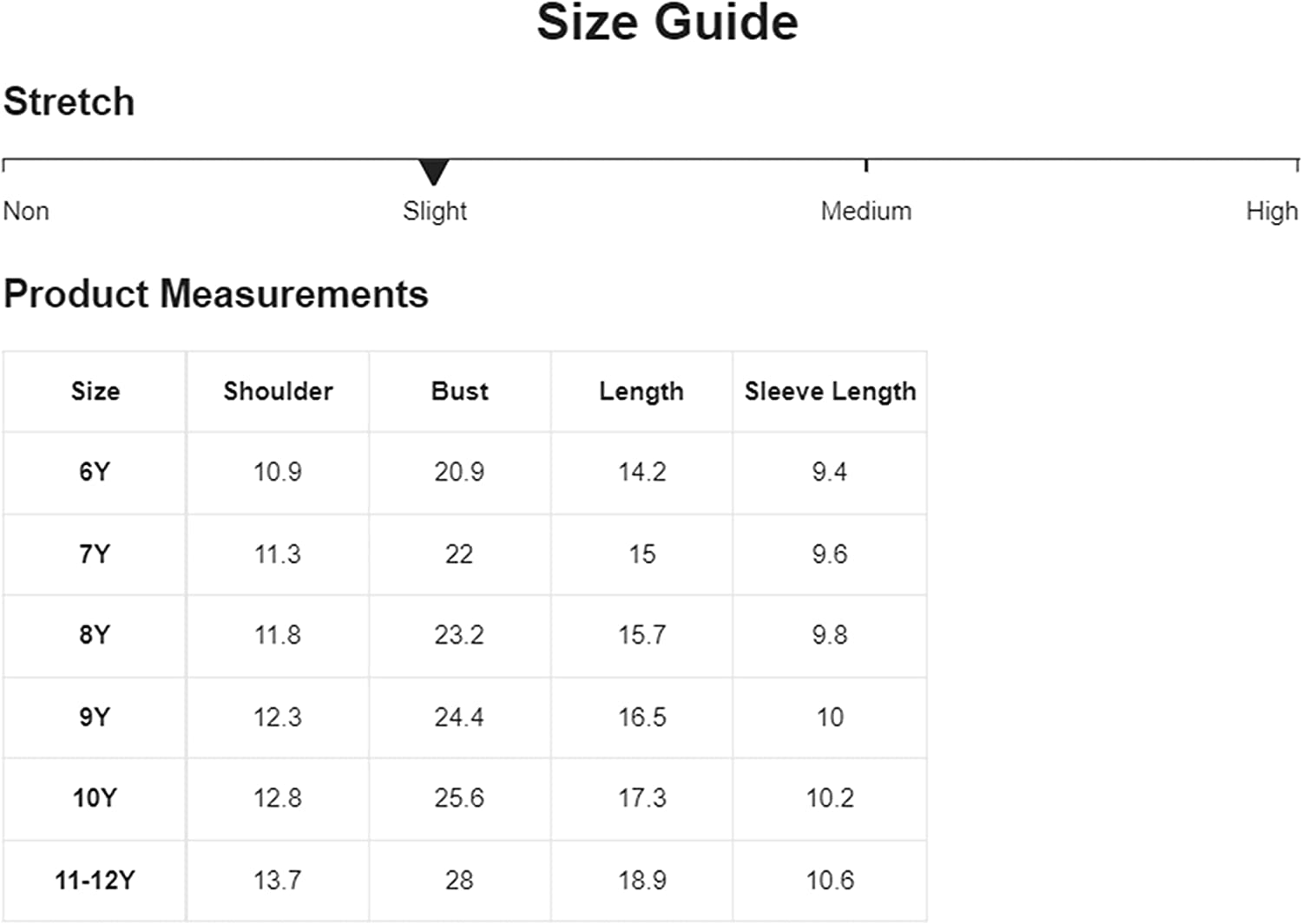 Size Chart:6Y: Shoulder: 10.9", Bust: 20.9", Length: 14.2", Sleeve Length: 9.4", / 7Y: Shoulder: 11.3", Bust: 22", Length: 15", Sleeve Length: 9.6", / 8Y: Shoulder: 11.8", Bust: 23.2", Length: 15.7", Sleeve Length: 9.8", / 9Y: Shoulder: 12.3", Bust: 24.4", Length: 16.5", Sleeve Length: 10", / 10Y: Shoulder: 12.8", Bust: 25.6", Length: 17.3", Sleeve Length: 10.2", / 11-12Y: Shoulder: 13.7", Bust: 28", Length: 18.9", Sleeve Length: 10.6"
