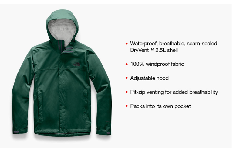 • RAINY ADVENTURES. Constructed with a waterproof, breathable, and seam-sealed DryVent 2.5L fabric, the Venture 2 is a classic year-round rain jacket designed to withstand backcountry storms and is styled for everyday use.