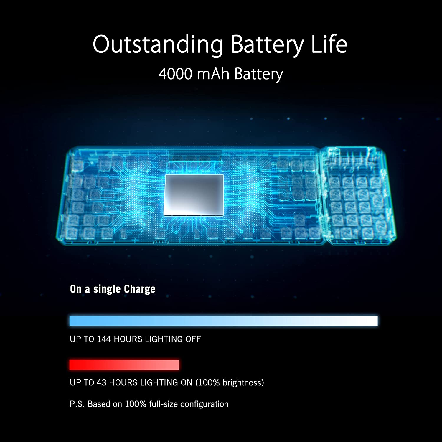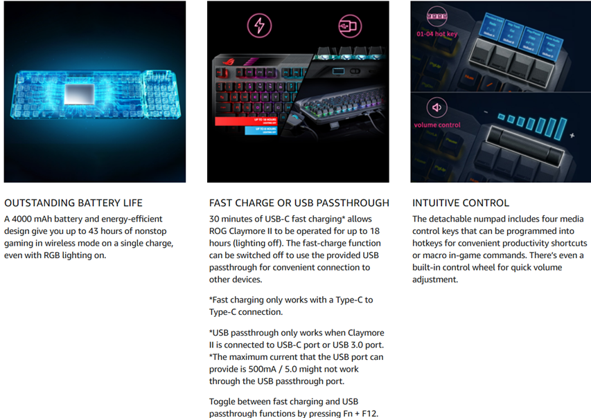 • FAST CHARGE OR USB PASSTHROUGH - 30 minutes of USB-C fast charging* allows ROG Claymore II to be operated for up to 18 hours (lighting off). The fast-charge function can be switched off to use the provided USB passthrough for convenient connection to other devices.