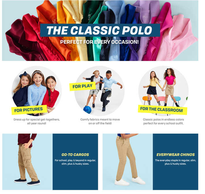 - THE CHILDREN'S PLACE — We offer a huge selection of kid's clothing! Shop us for jeans, shorts, leggings, chinos, polo shirts, dresses, pajamas, and accessories.