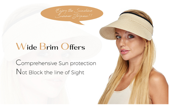 Wide brim Straw Visor: The length of the womens visor's brim is 13cm, and the longer brim provides you with more comprehensive UV protection; Women's sun hats have UPF 50+ sun protection function; The straw beach hat helps to cover your face, thereby protecting your skin from Ultraviolet rays damage and may prevent age spots;
