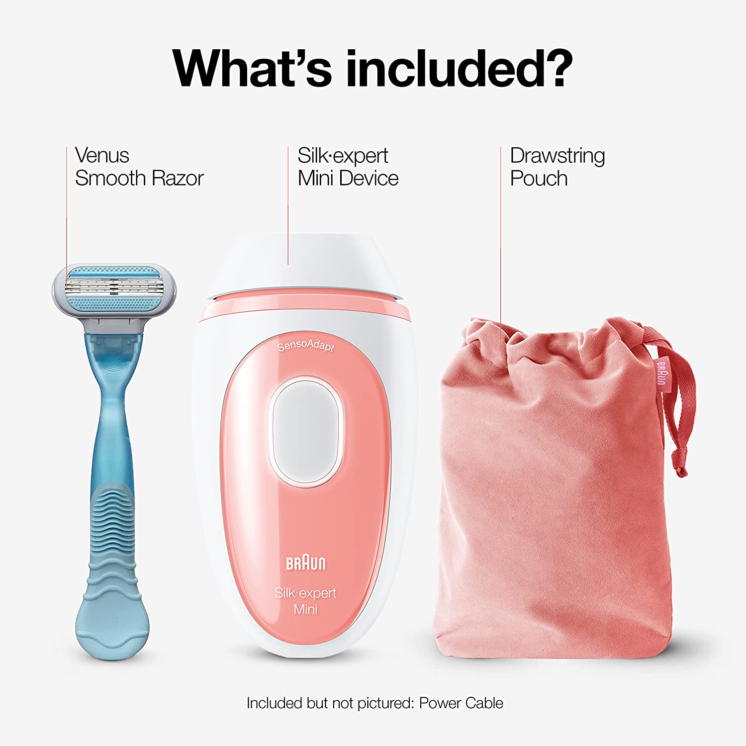 Silk·expert Mini is a safe, easy and efficient** IPL hair removal system for women. For visible hair reduction in just three months*. With SensoAdapt technology for safe use on skin: it automatically and continuously adapts to your skin tone to ensure optimal balance between efficacy and safety, for visible long-lasting hair removal from the comfort of your home. No complicated settings, easy to use. Compact design for easy handling. Travel pouch for on-the-go. *If used per the recommended regimen, individual results may vary **Efficiency based on the combination of window size, speed and energy. Safety technology shared with Cyden Box includes: 1x Silk·expert Mini 1x Pink travel pouch 1x Venus razor