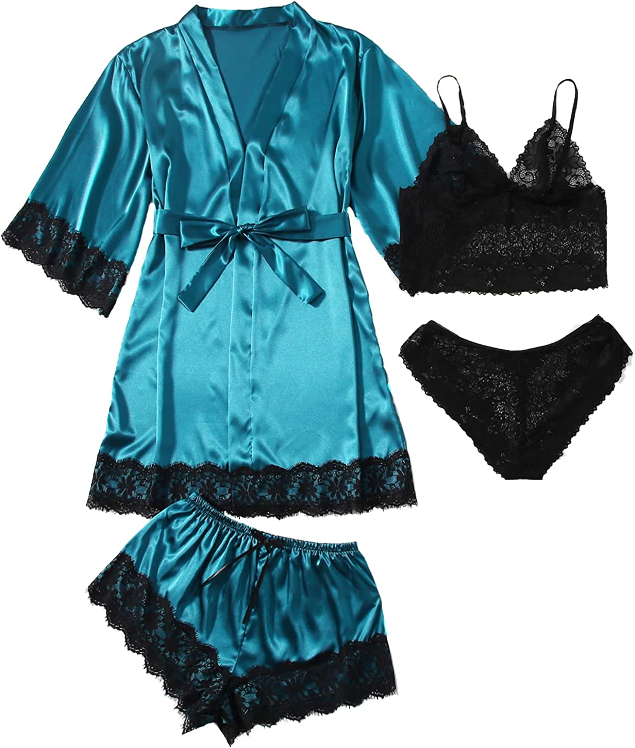 SOLY HUX Women's Satin Pajama Set 4pcs Floral Lace Trim Cami Lingerie Sleepwear with Robe