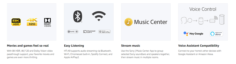 Immerse yourself in a multi-dimensional audio experience with the HT-A9 home theater system. Unique 360 Spatial Sound Mapping technology calibrates sound to your room for an environment that seems to expand beyond the walls. Support for 8K HDR, 4K 120p passthrough, and Dolby Vision video passthrough make your favorite movies and games sound out of this world.