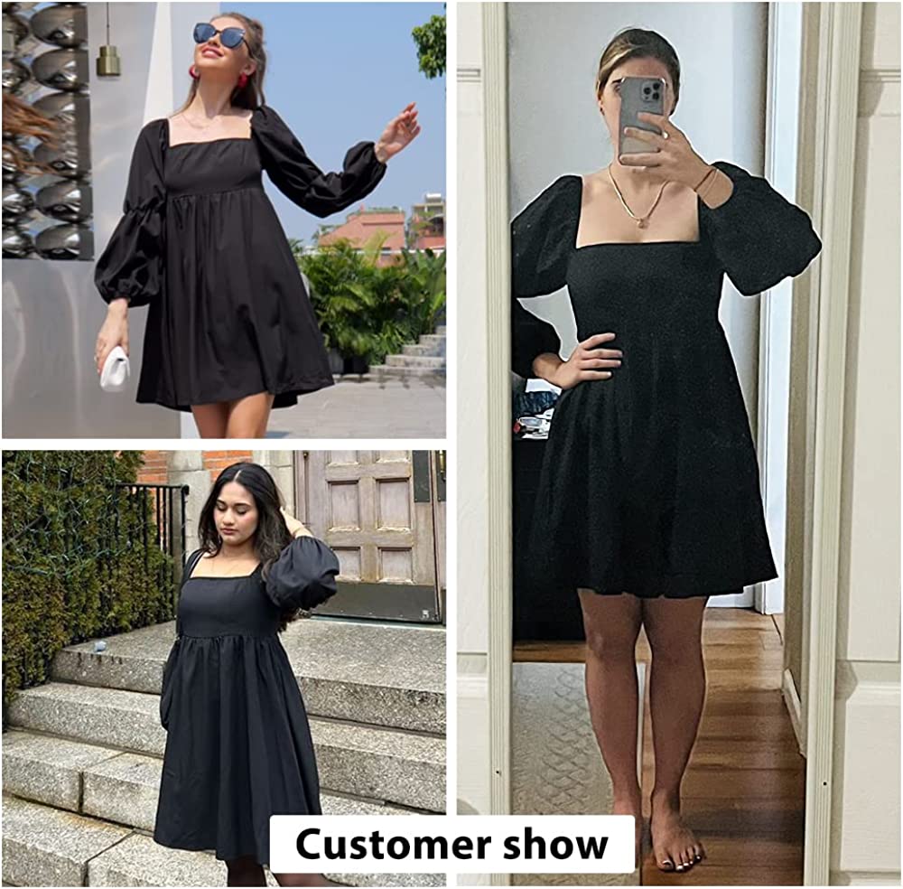 EXLURA Womens Square Neck Dress Long Puff Sleeve A-Line Casual Short Mini Dress