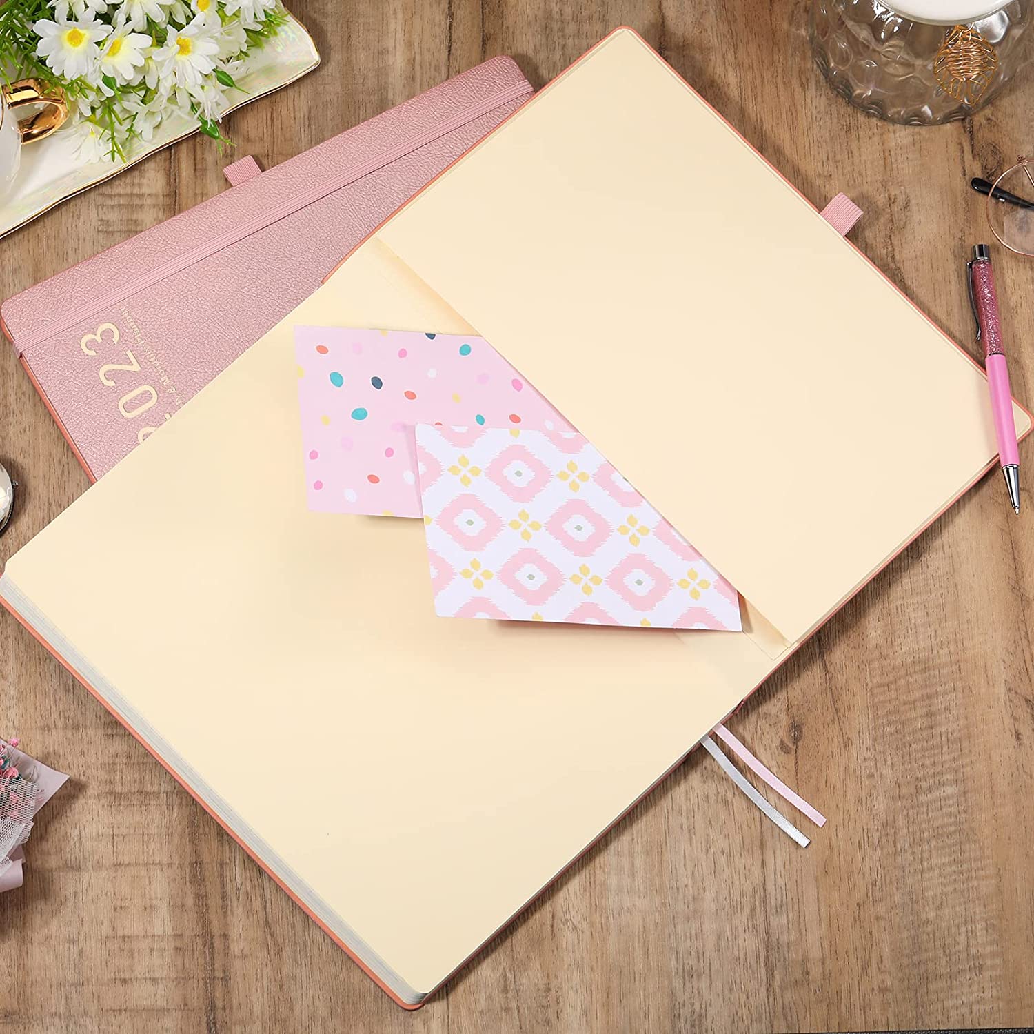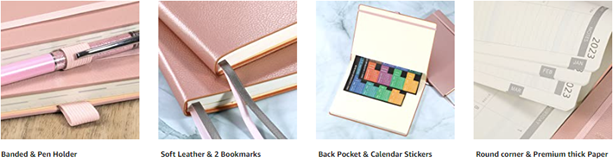 • Round arc corner/Pen holder/2 bookmarks/Inner pocket/Elastic closure banded/Gift box