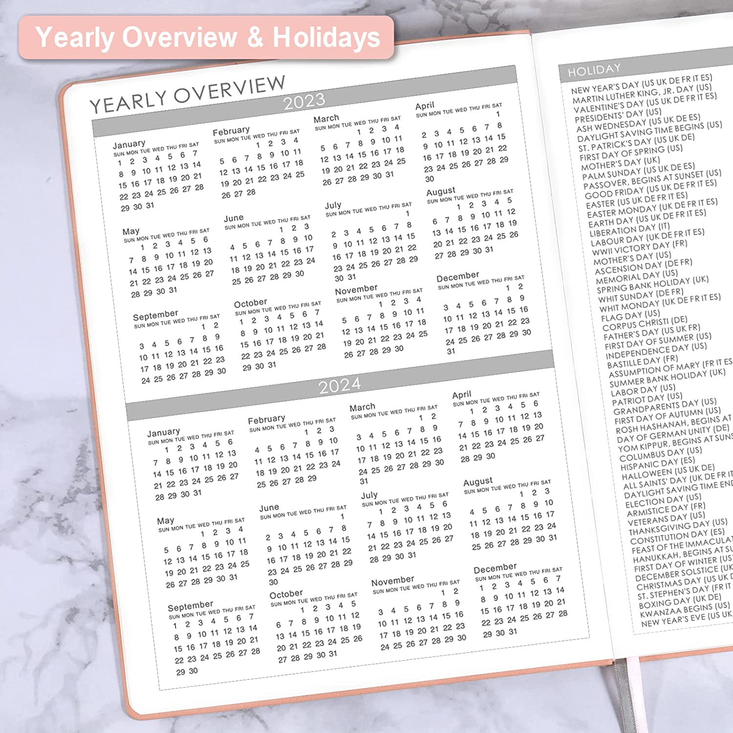 • ✨ Durable soft leather cover, excellent texture. 2023-2025 yearly holidays lets you master the holidays clearly. The planner 2023-2024 offers unruled monthly pages/ruled weekly layouts for detailed planning.