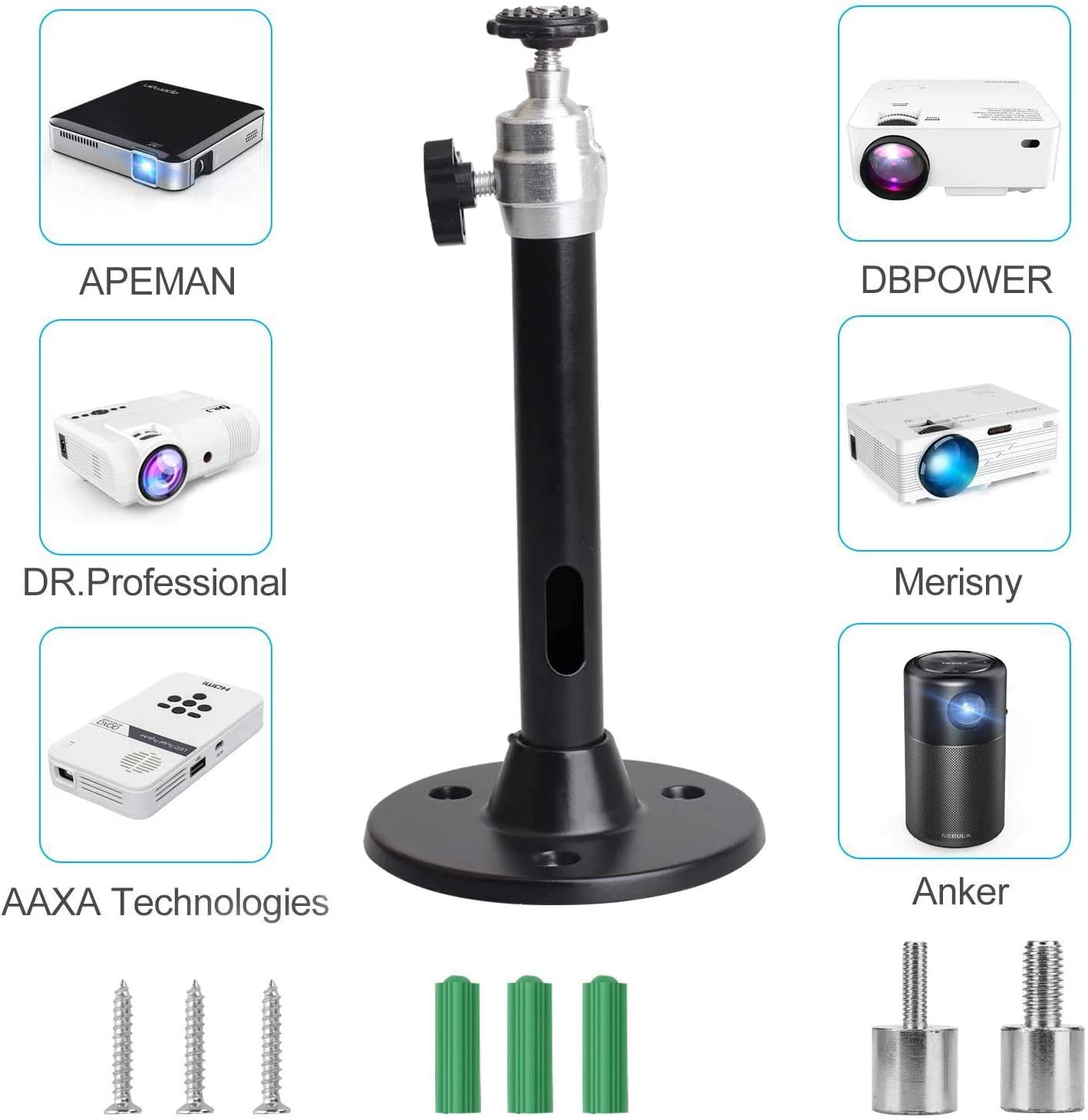 Compatible with: The mini projector mount compatible with QKK, DR.J, DBPOWER, Anker, VANKYO, AAXA, Jinhoo, PVO, TMY, AuKing, CiBest, FANGOR and Most Other Mini Projector.