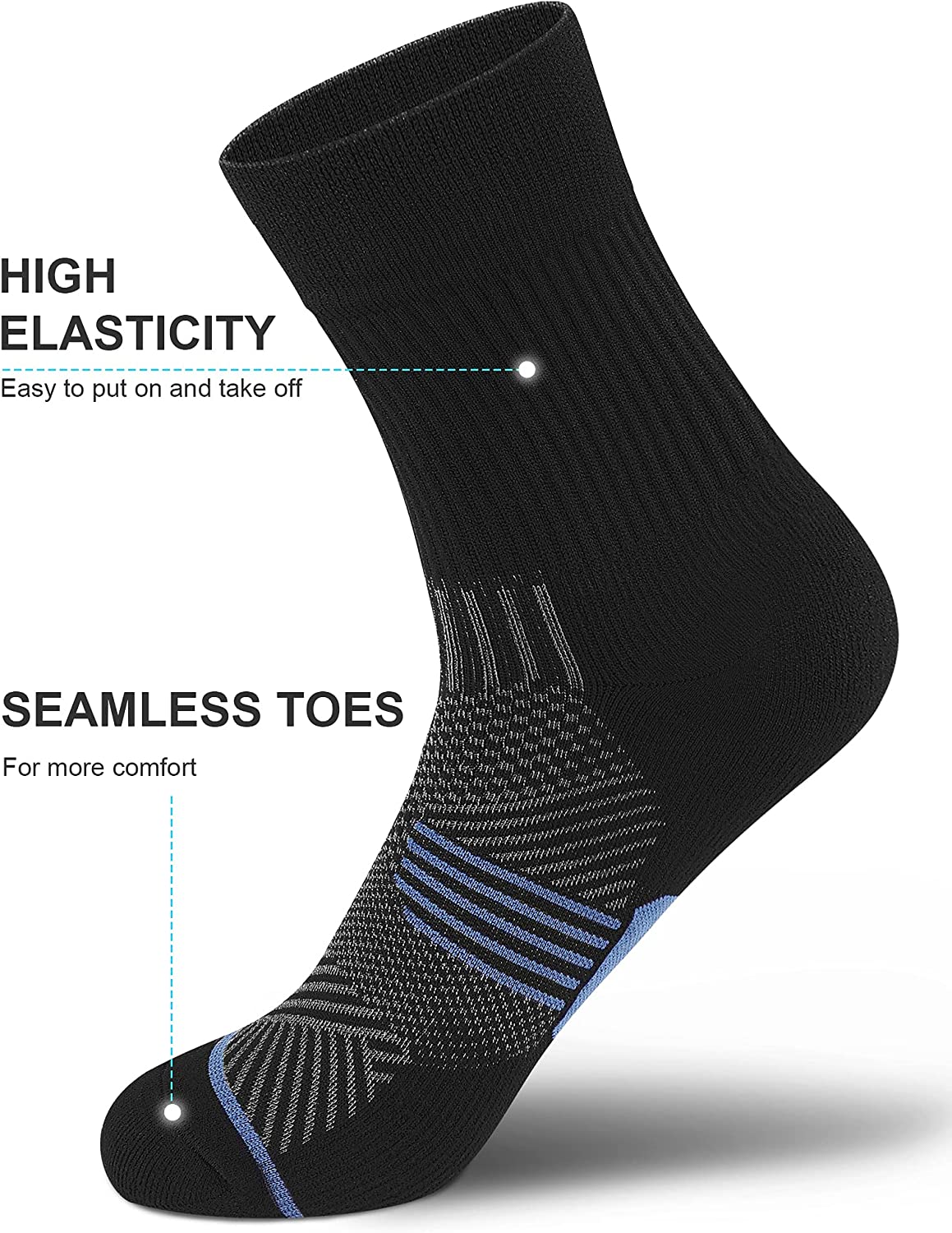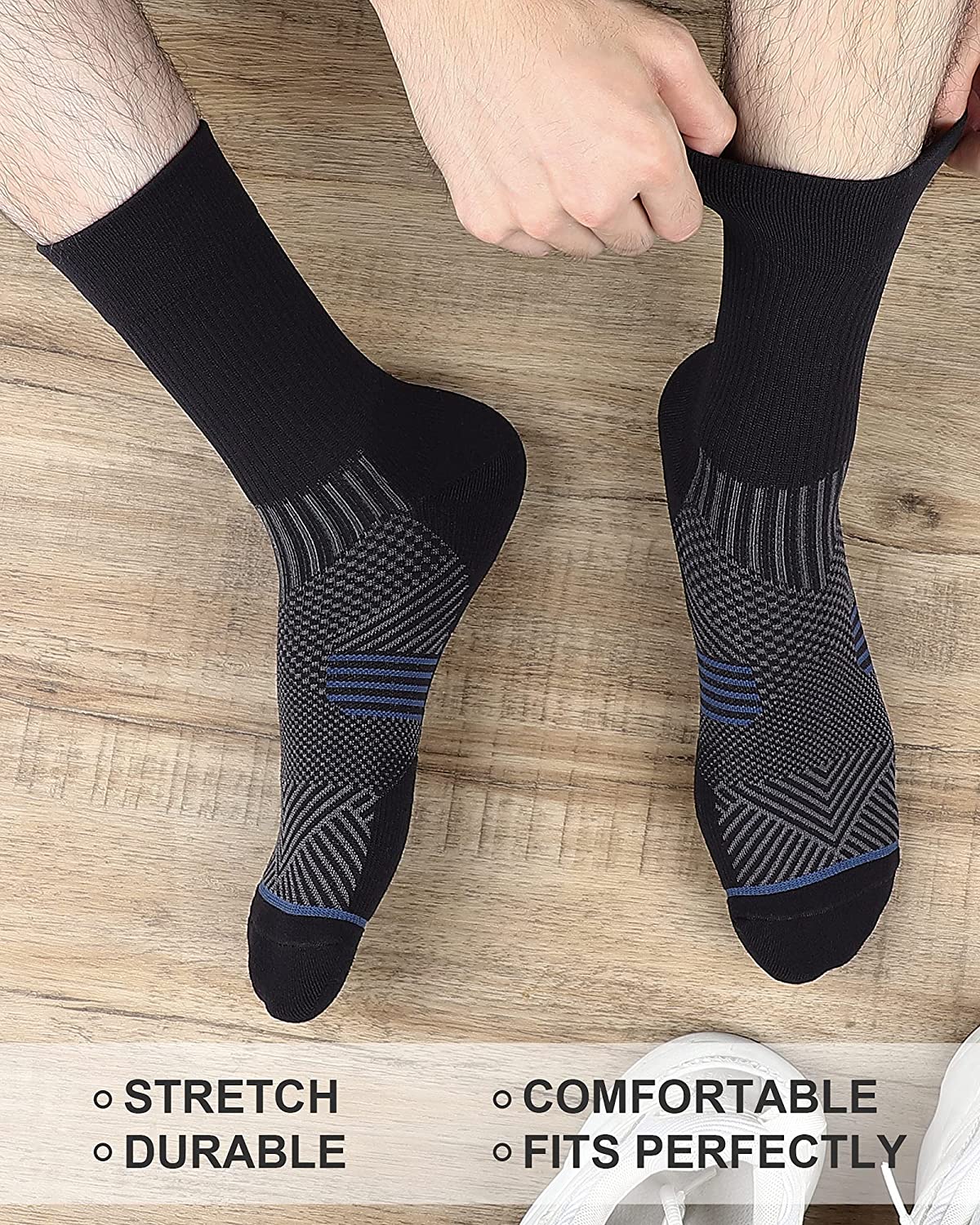 • HIGH QUALITY & DURABLE: Mens compression crew socks are made of high-quality material, which can absorb moisture and sweat and keep your feet dry all day. Reinforced heel and toe area to enhance the durability of the athletic socks, even if worn for a long time. This is not the kind of crew socks you replace after 10 washes!